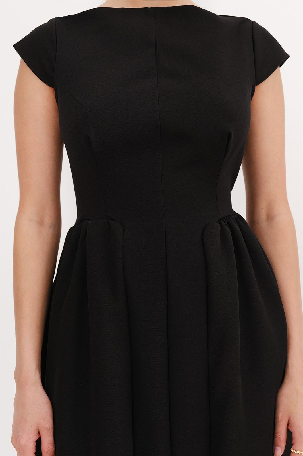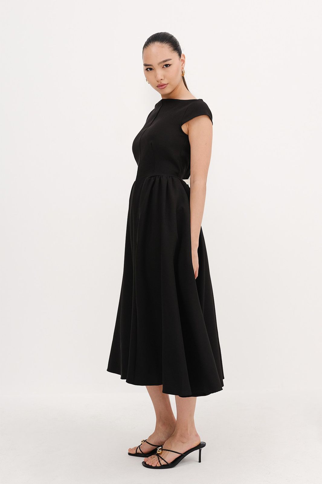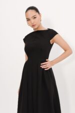 فستان ميدي أنيق بلون أسود بتصميم ياقة قارب وفتحة ظهر، مزود بسحاب، جيوب، وتفاصيل خصر أنثوية مع بطانة داخلية.