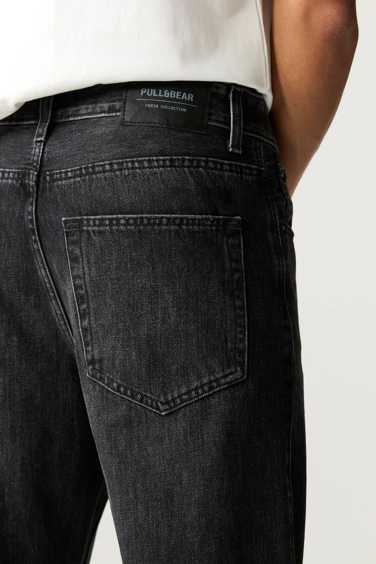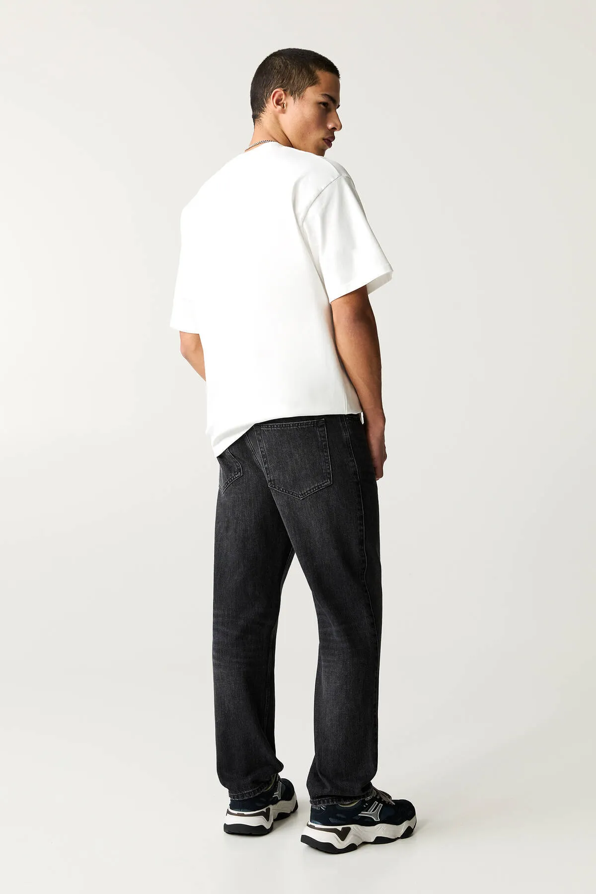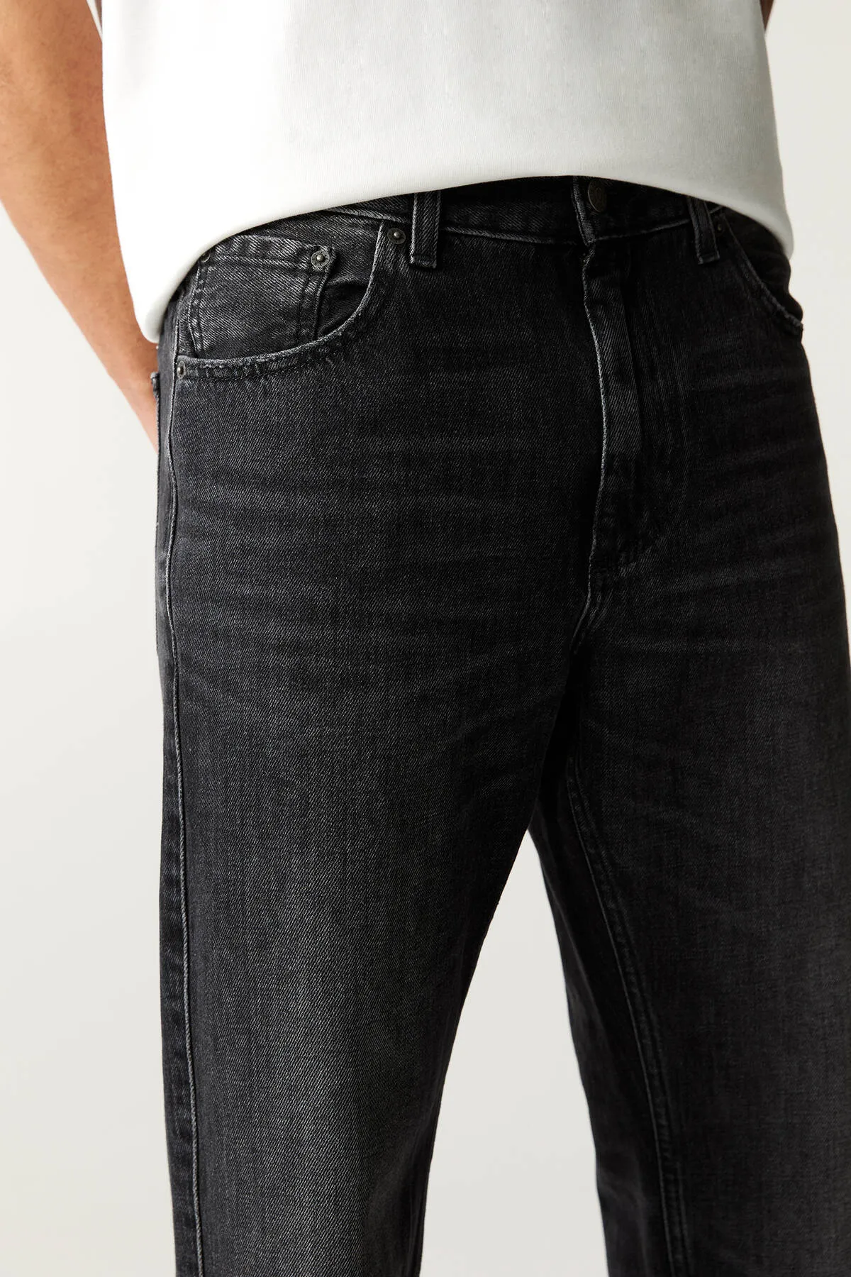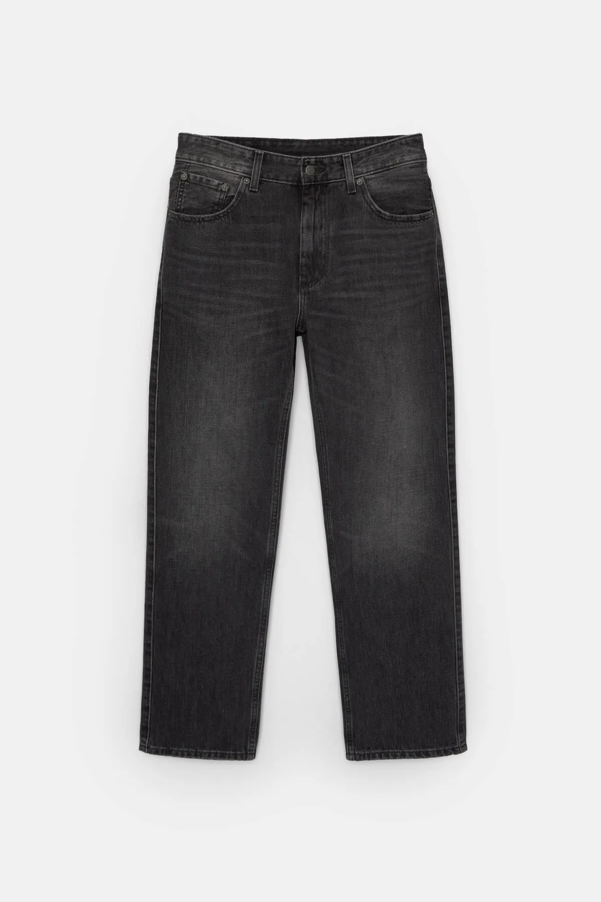 بنطلون جينز مستقيم مصنوع من القطن، بتصميم بخمسة جيوب، وحلقات للحزام، وسحاب وأزرار للإغلاق في الأمام. 100% قطن