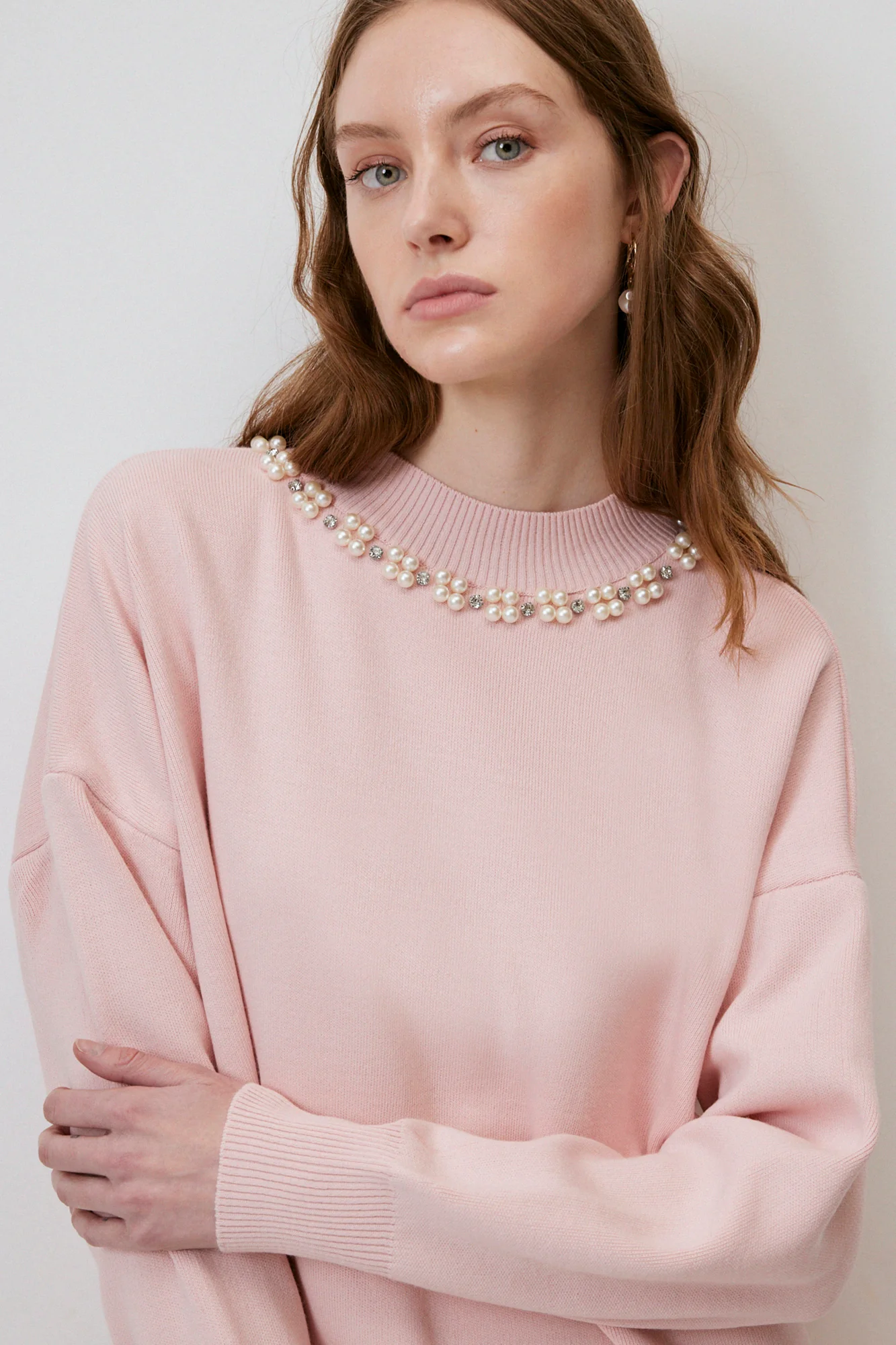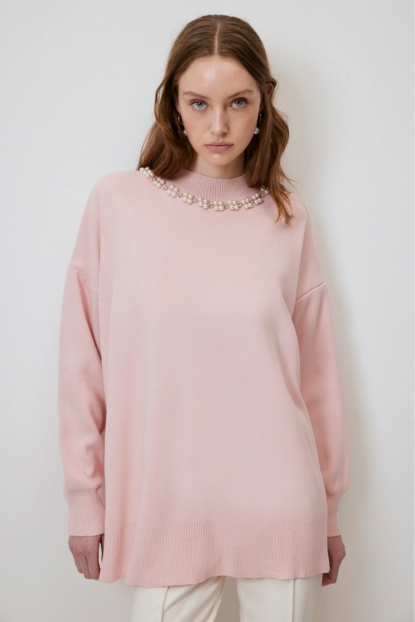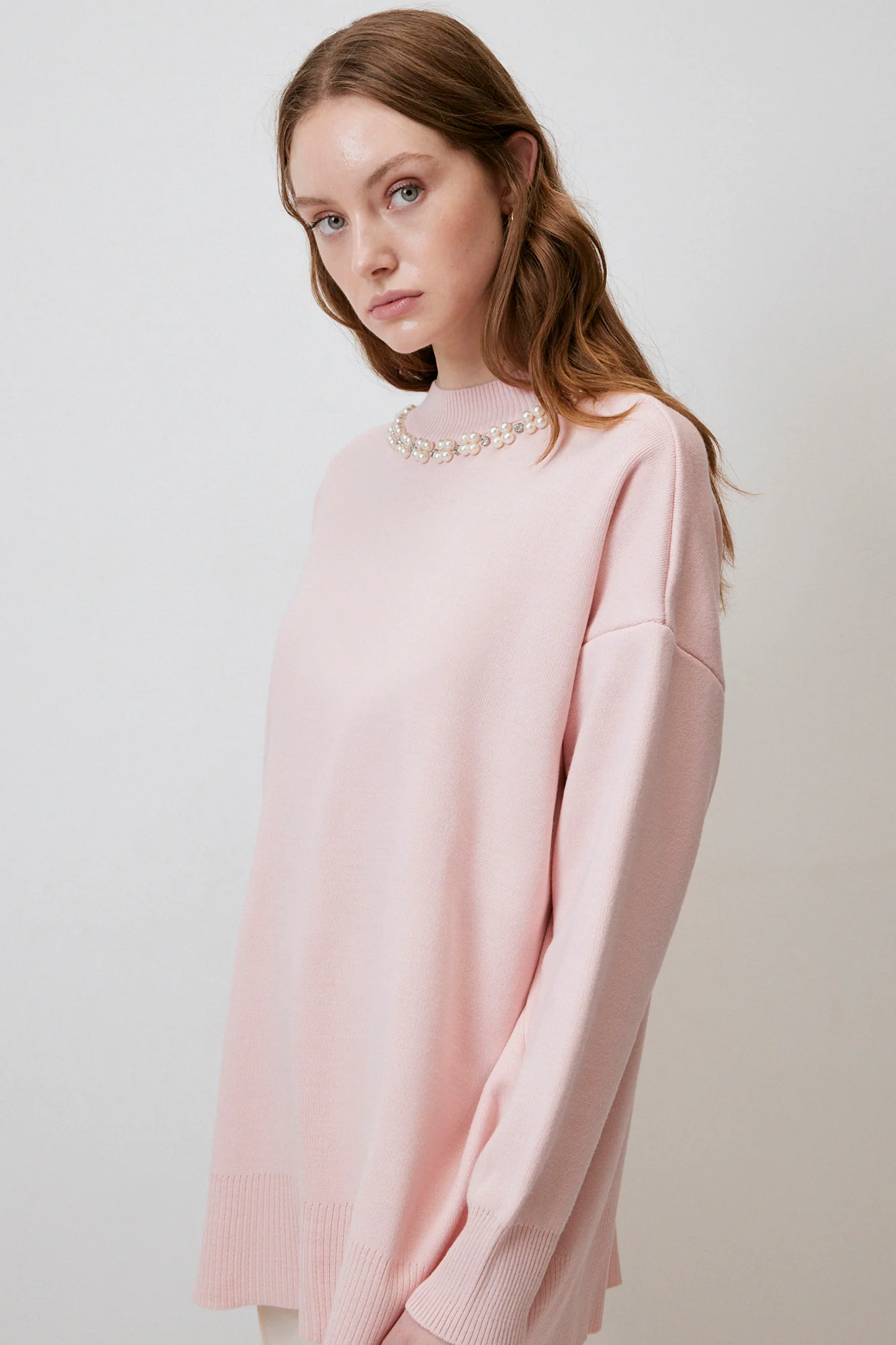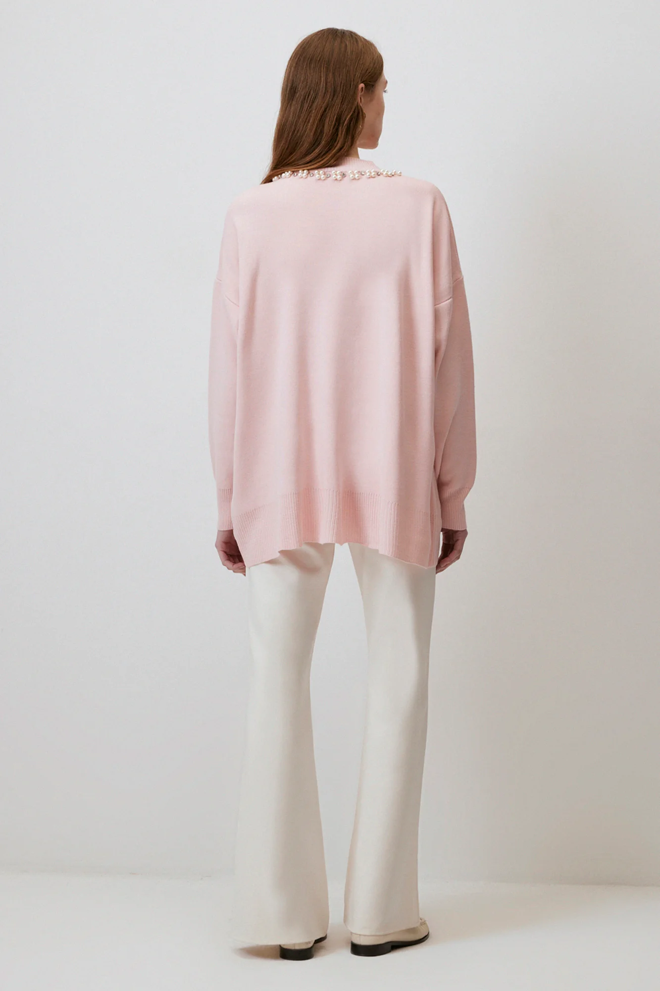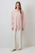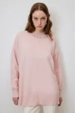 تفاصيل: رقبة دائرية، أكمام طويلة، أكتاف منسدلة، مقاس كبير، تفاصيل لؤلؤية، ملمس ناعم،