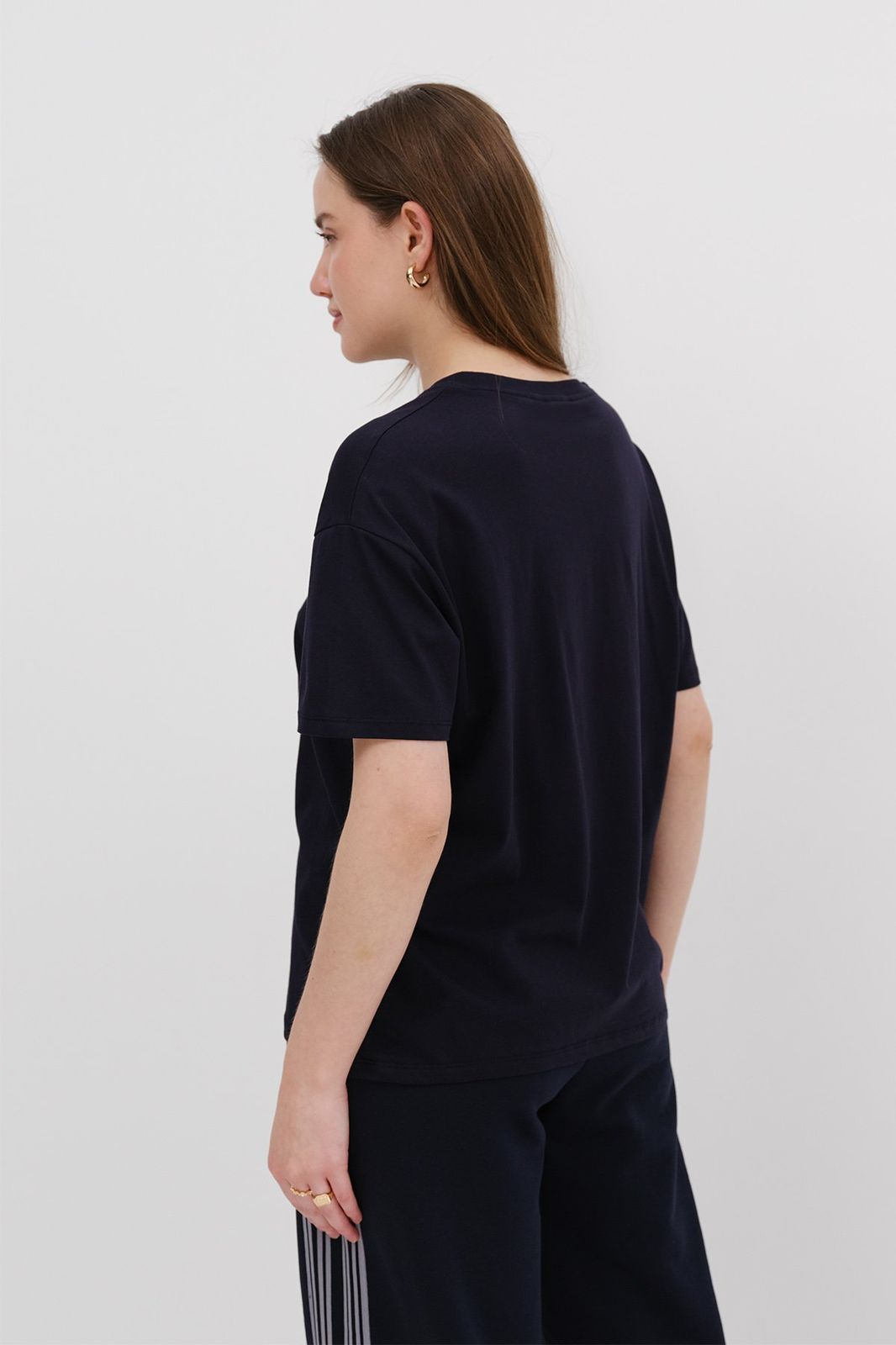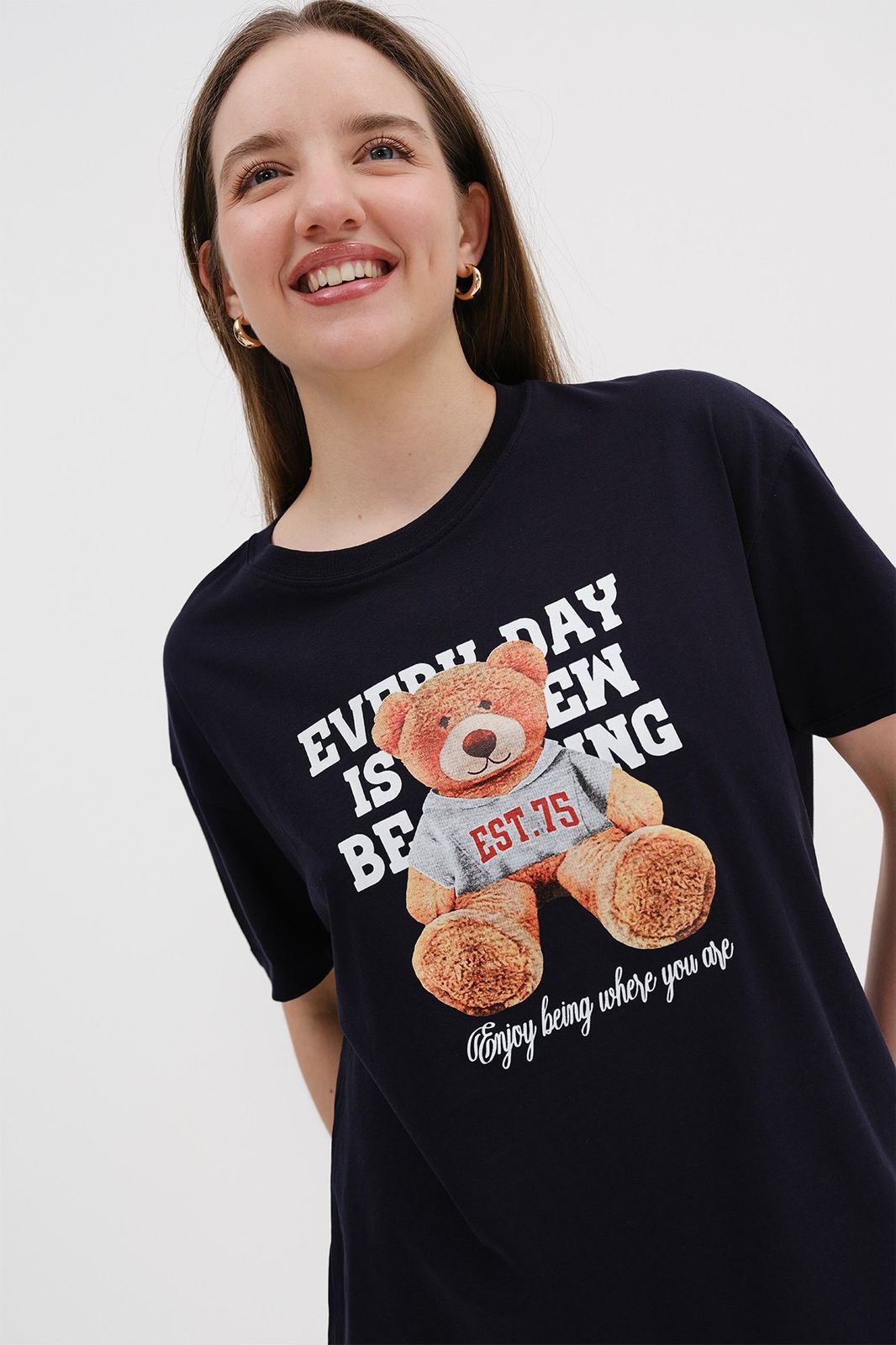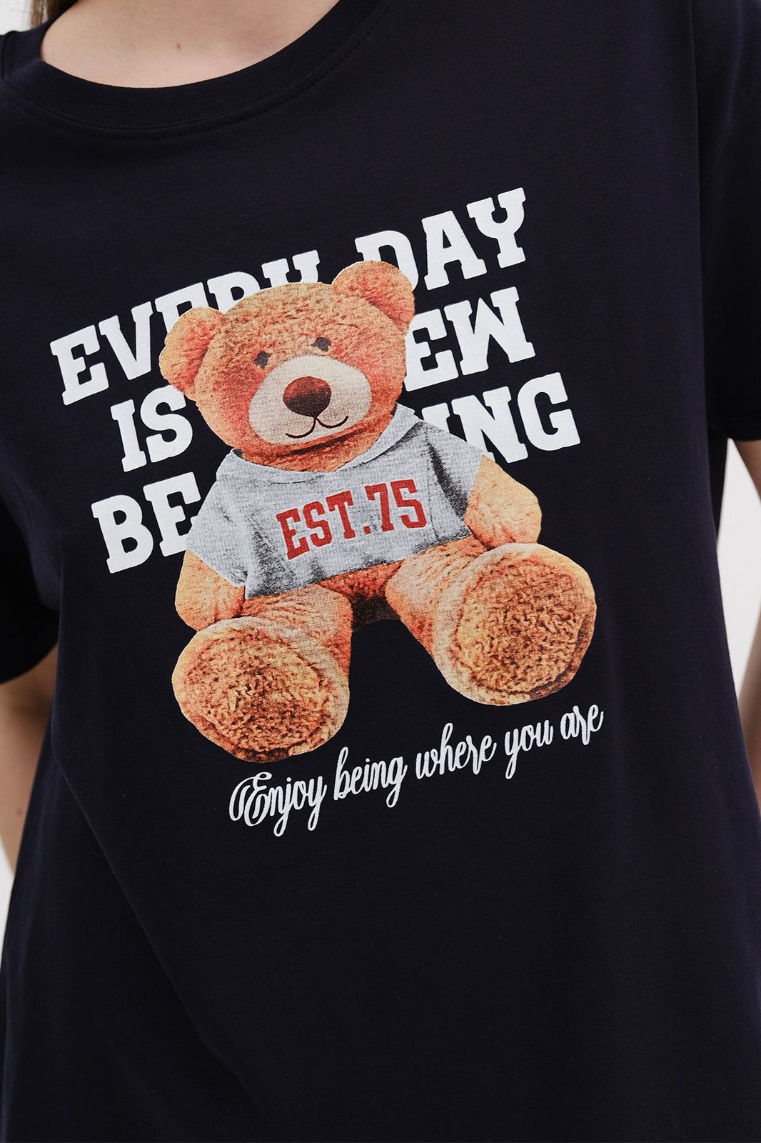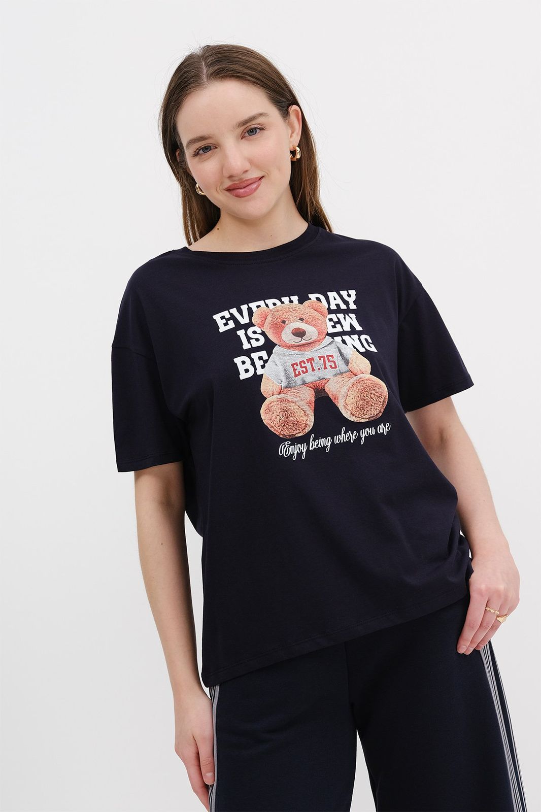 تيشيرت قطن 100% بلون كحلي مع طباعة دب أنيقة، تصميم مريح مثالي للإطلالات اليومية العصرية.