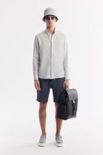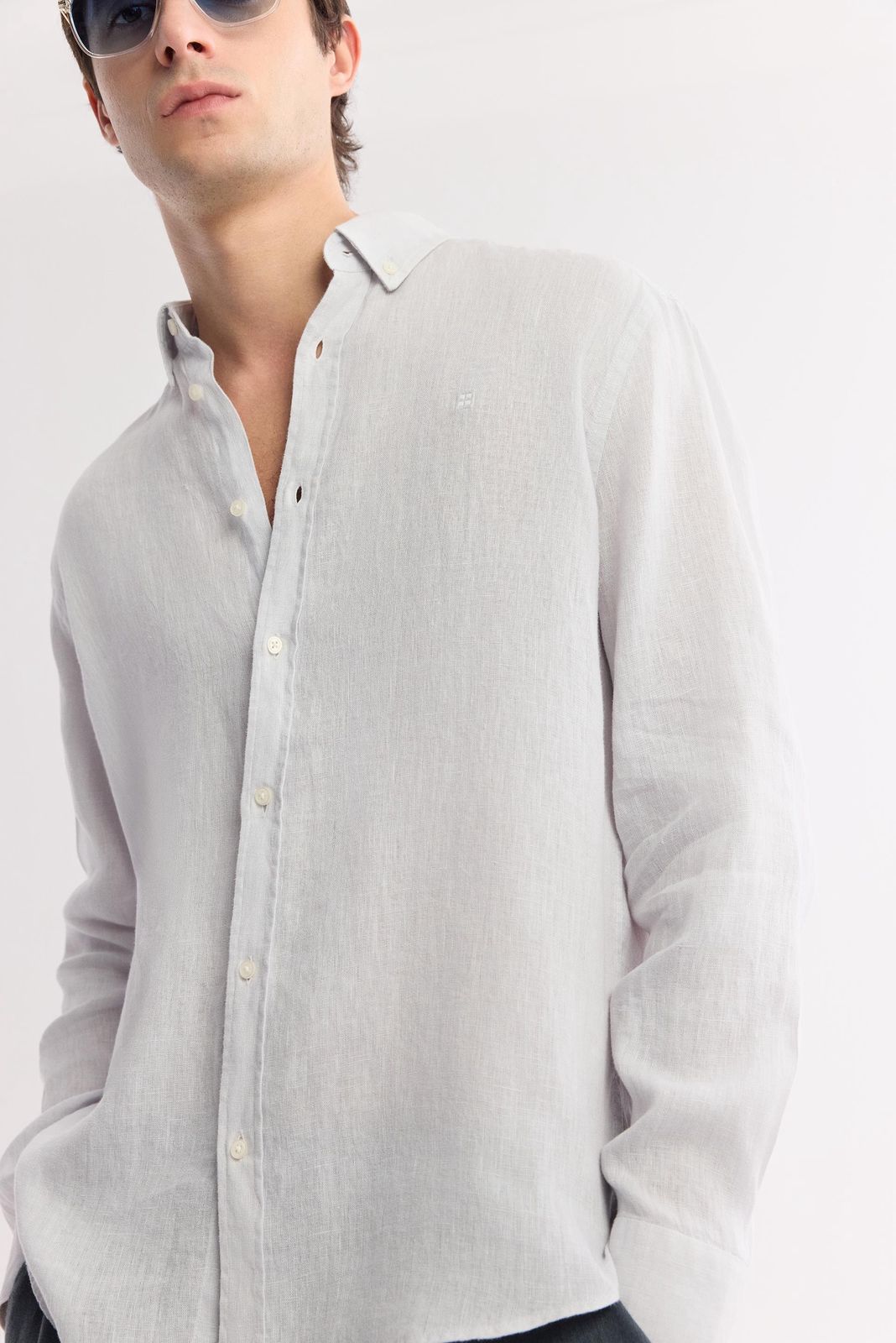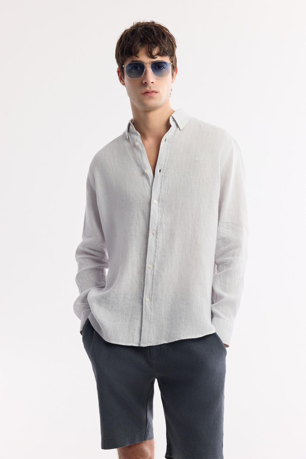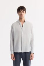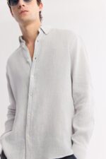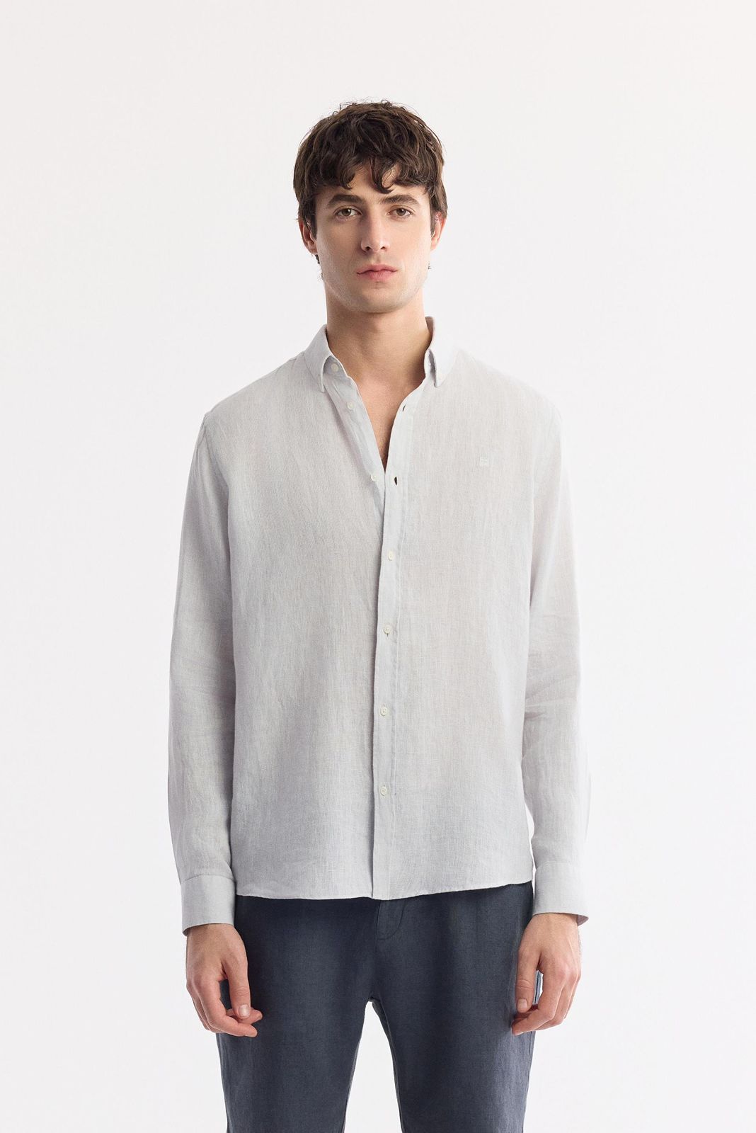 قميص كتان رجالي بأكمام طويلة وتصميم مريح، مزوّد بياقة بأزرار وتفاصيل شعار مطرّز على الصدر.