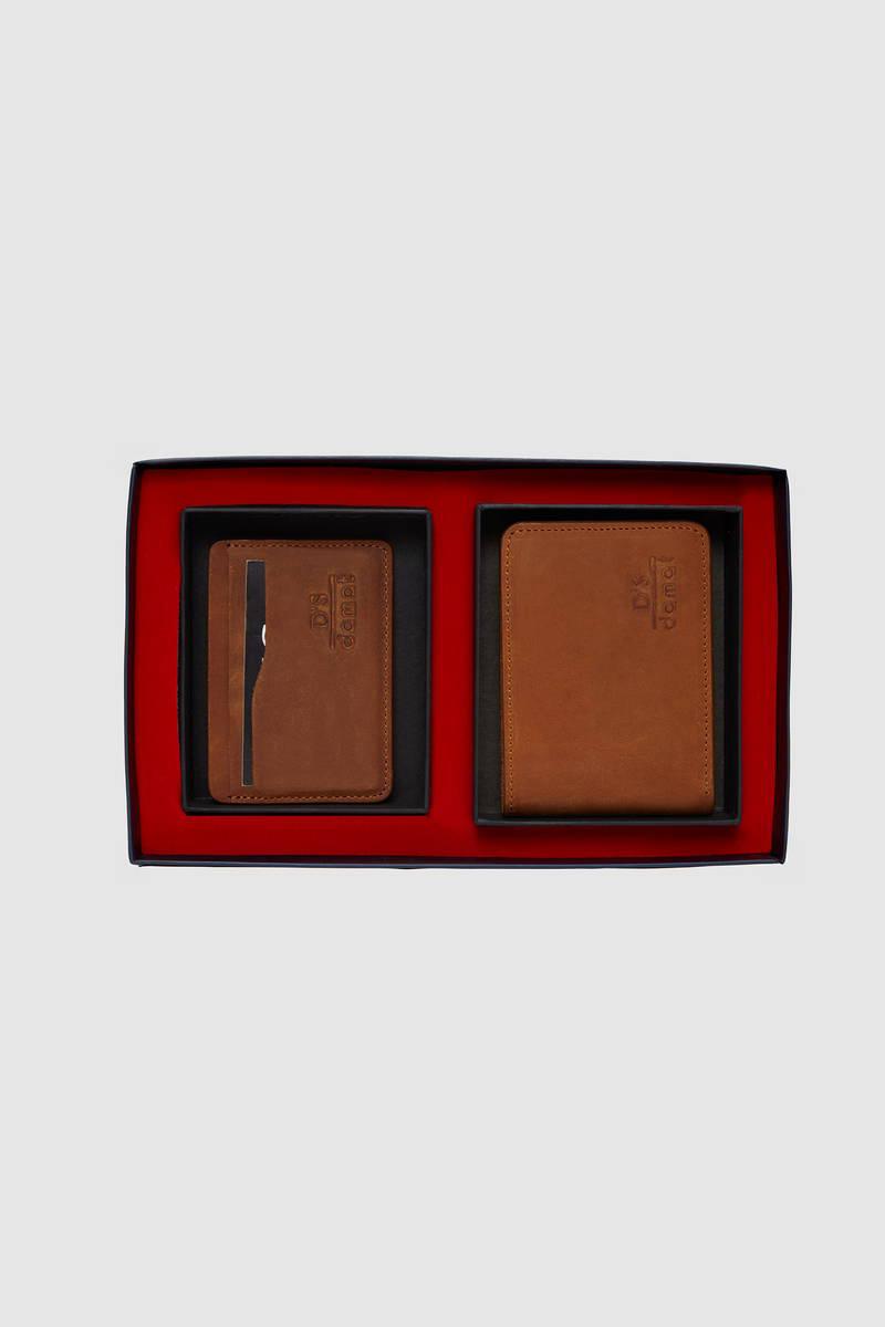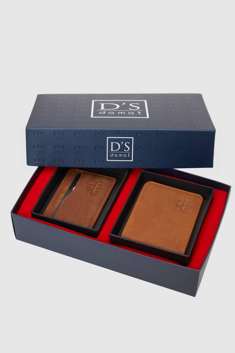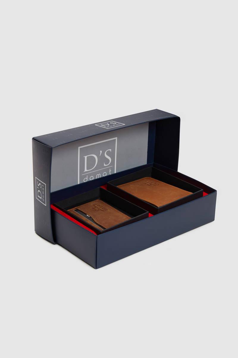 طقم إكسسوارات أنيق من Ds Damat يحتوي على محفظة وحافظة بطاقات داخل علبة مميزة، مثالي للإهداء والذوق الرفيع.
