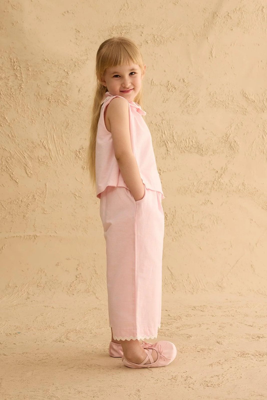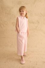 طقم ناعم وأنيق مكوّن من بلوزة بدون أكمام وبنطال واسع، مصنوع من قماش أوكسفورد قطني مريح. يتميز بتفاصيل الشق الجانبي، ولمسات سوتاش ناعمة، مع بنطال بخصر مطاطي وجيوب عملية. تصميم مثالي للأطفال للحركة والراحة في الإطلالات اليومية والمناسبات.