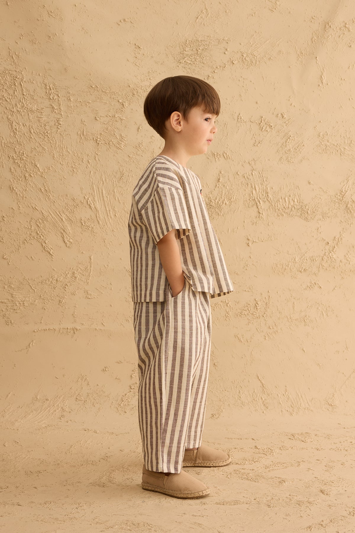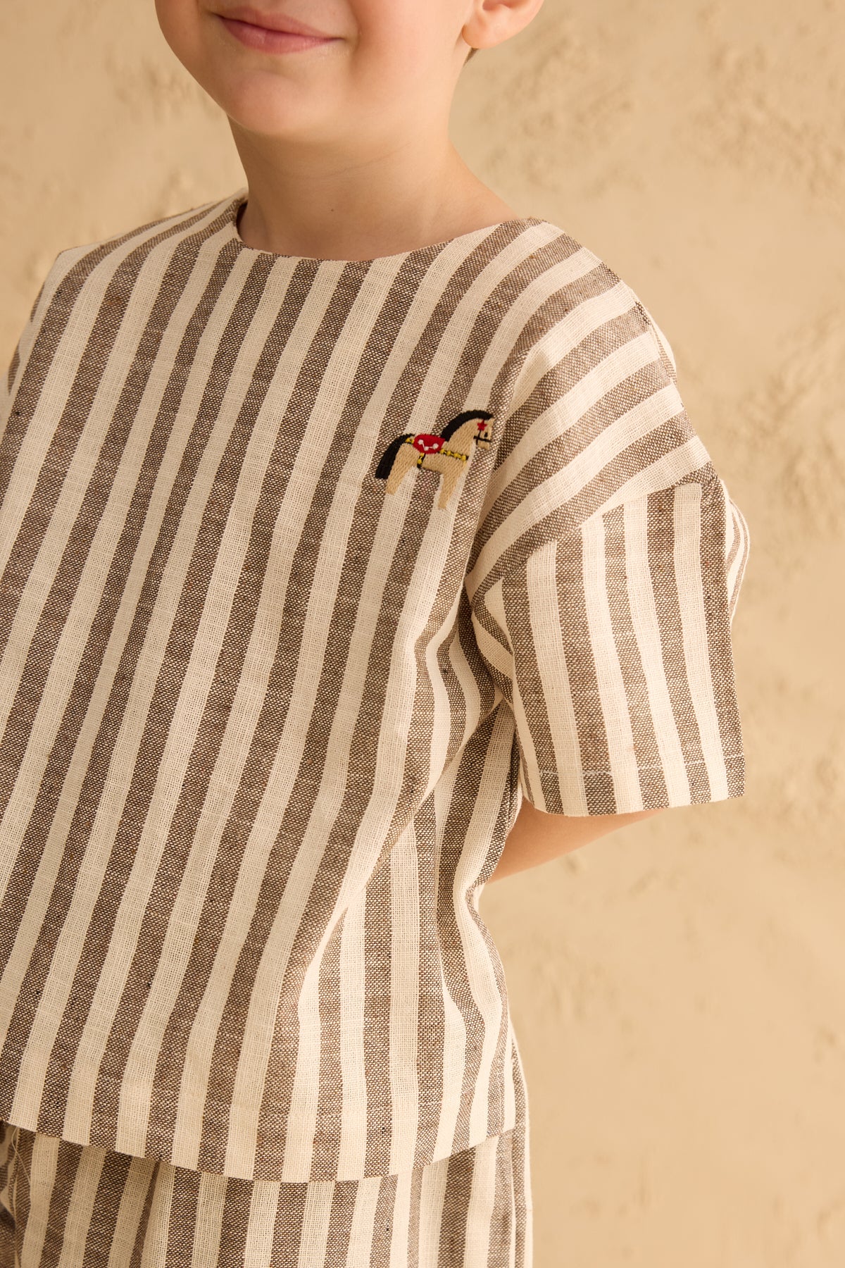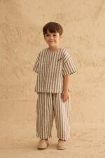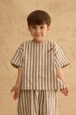 أضيفي لمسة من الأناقة الطبيعية إلى إطلالة طفلك مع هذه البلوزة الواسعة والمريحة المصنوعة من قماش قطني مخطط عالي الجودة.