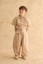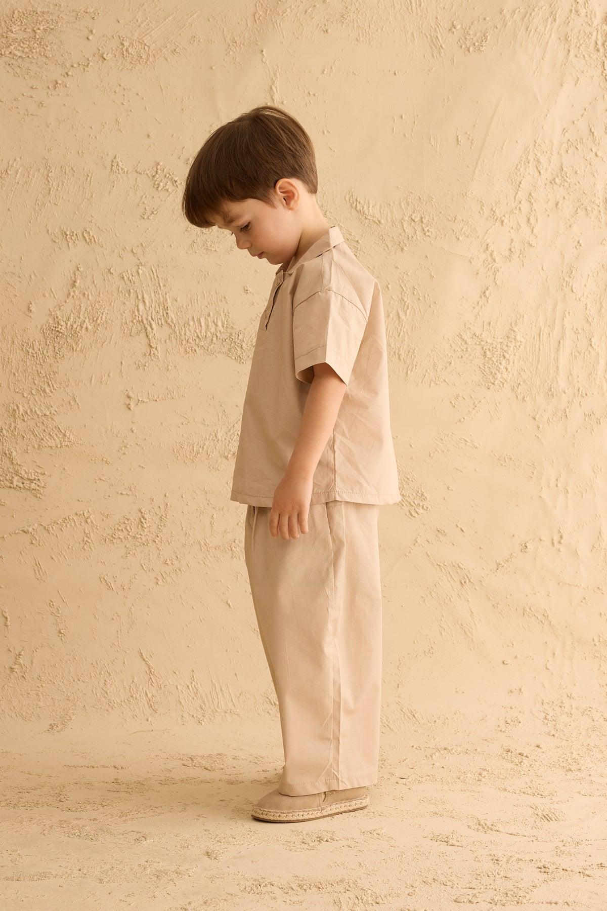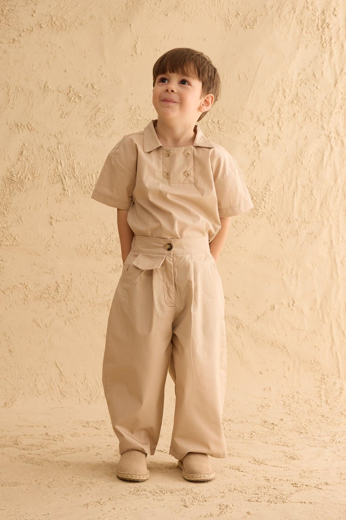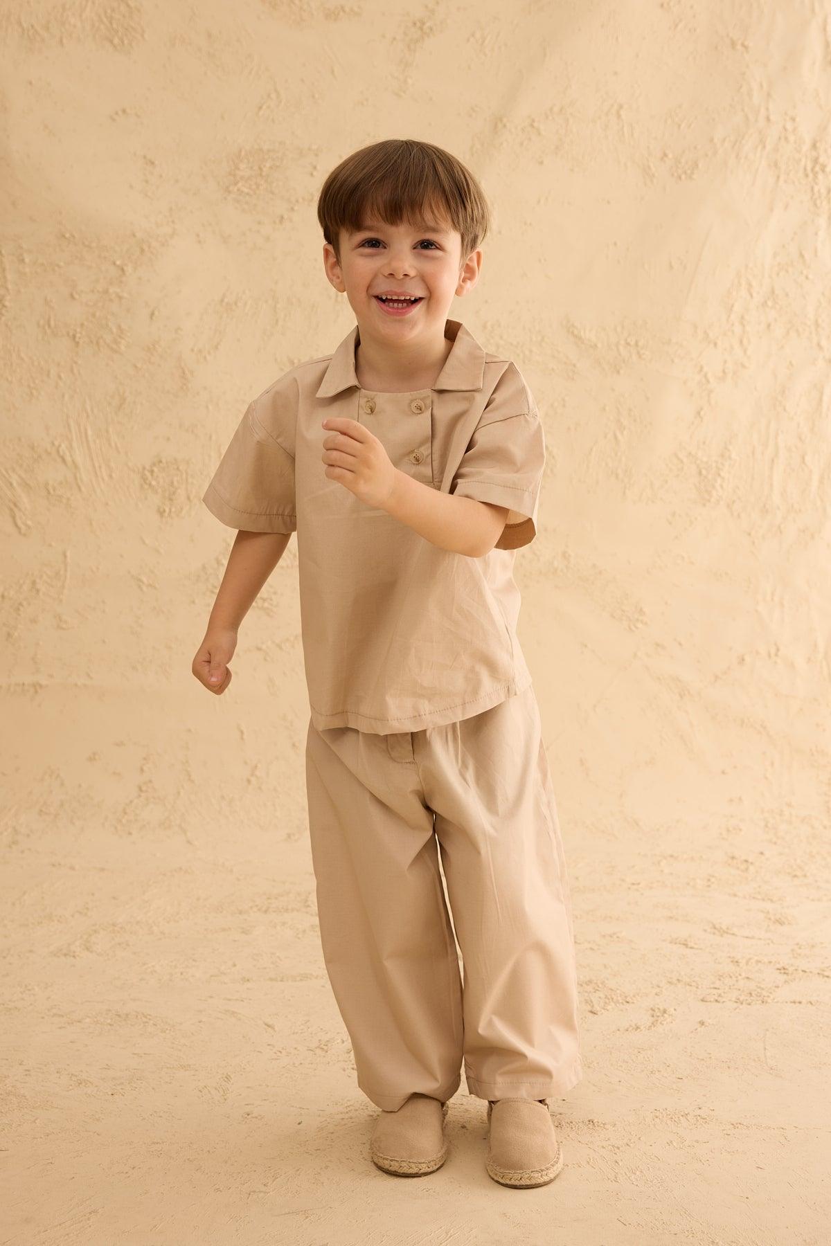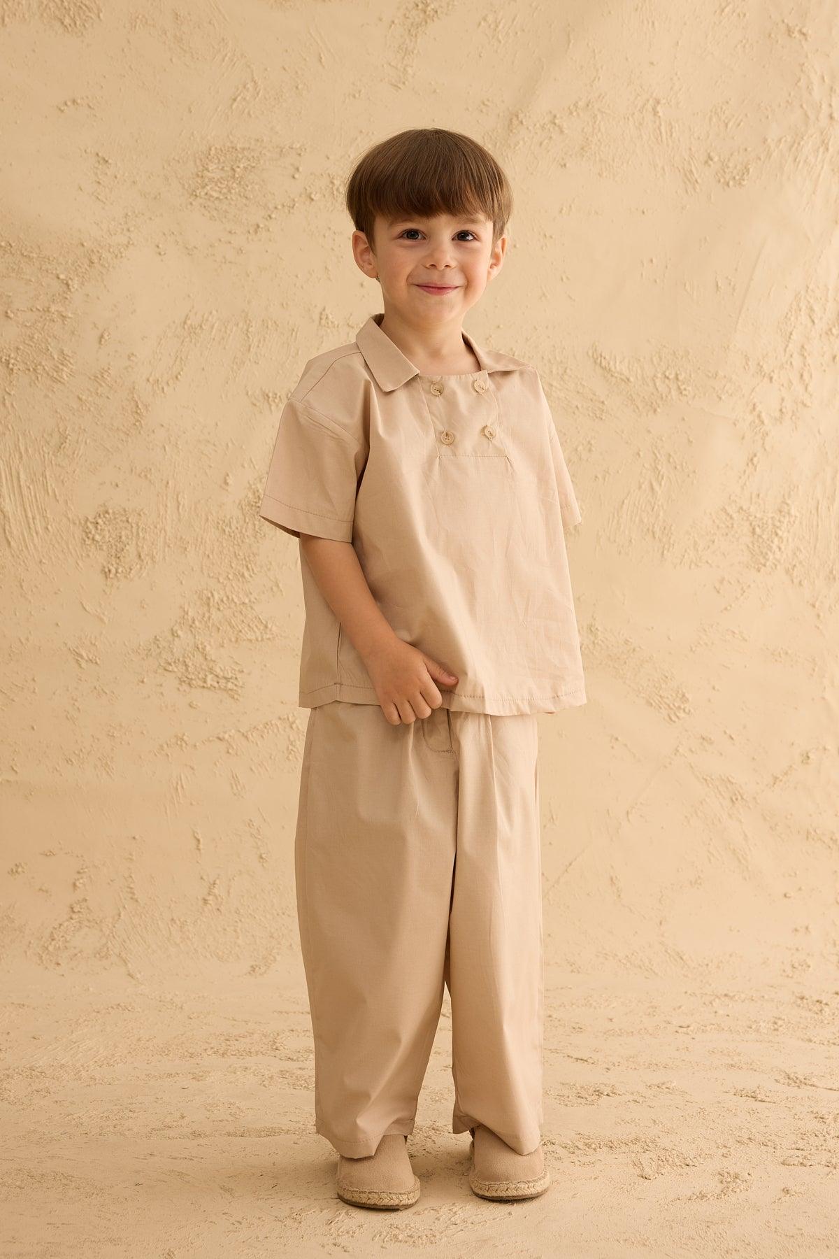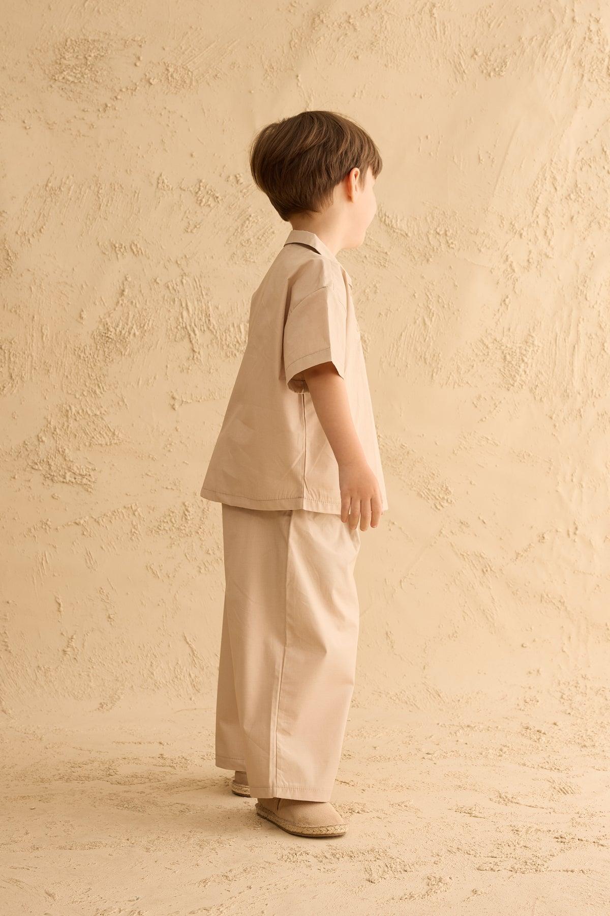 قميص أطفال أنيق من القطن 100% بلون بيج فاتح وتصميم مزدوج الأزرار، مريح وواسع لإطلالة صيفية كلاسيكية.