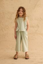 طقم أنيق من قطعتين للأطفال بلون أخضر، بتفاصيل شق أنيقة وتصميم مريح من قماش قطني عالي الجودة.