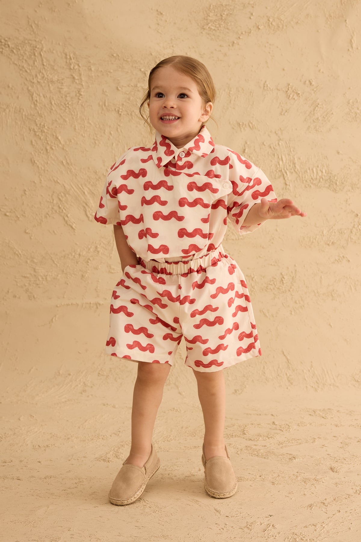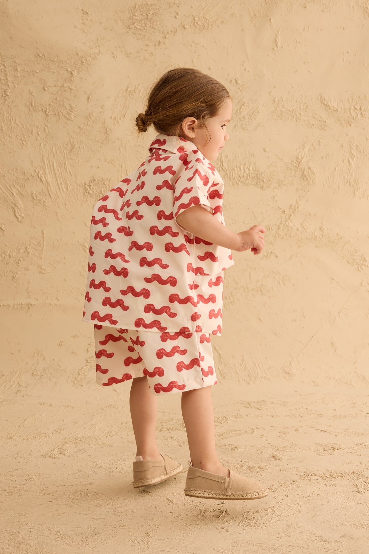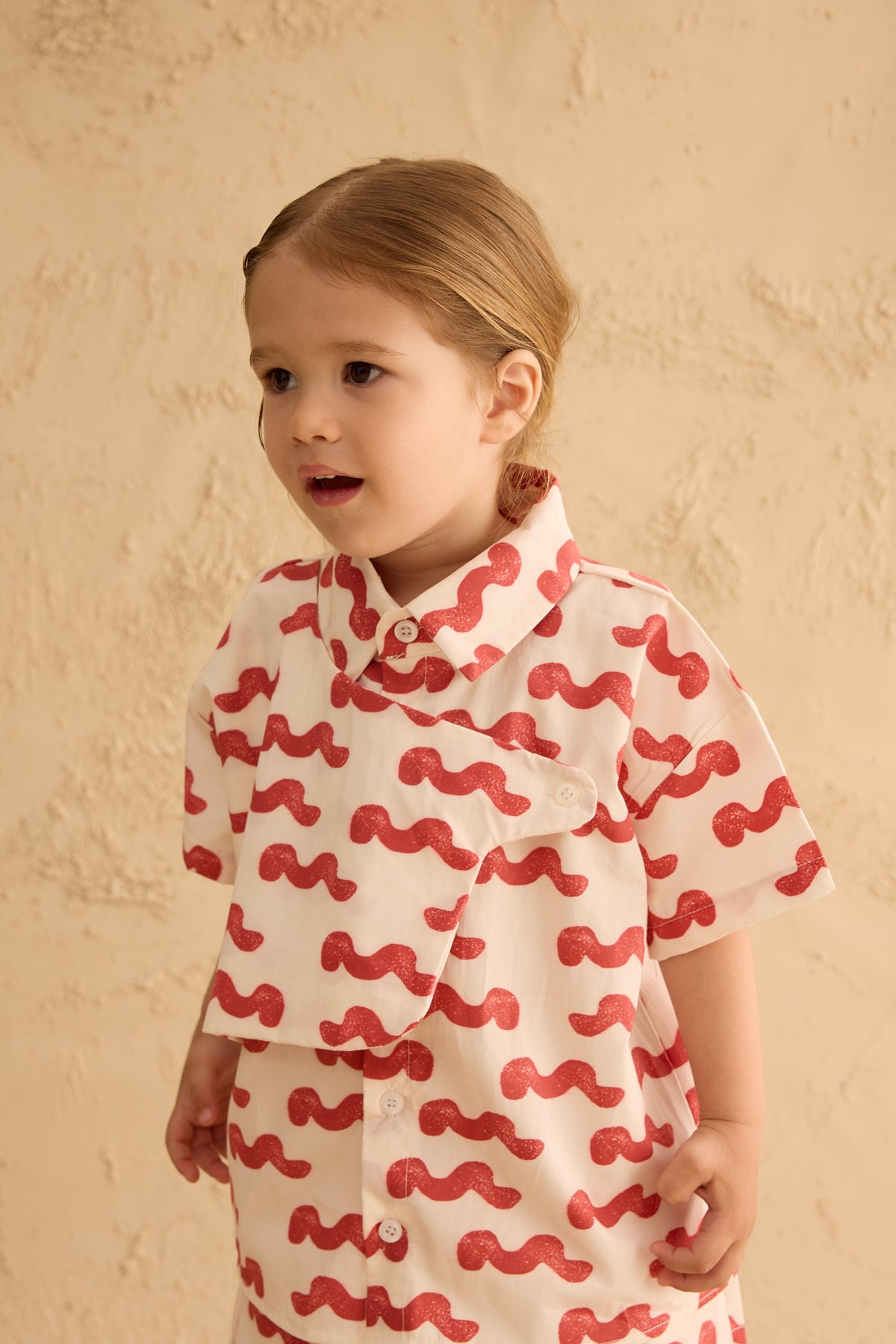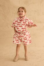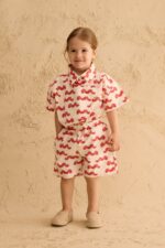 طقم صيفي أنيق للأطفال بلون أحمر مميز، مصنوع من قطن عضوي بنقشة فنية وتصميم عملي ومريح.