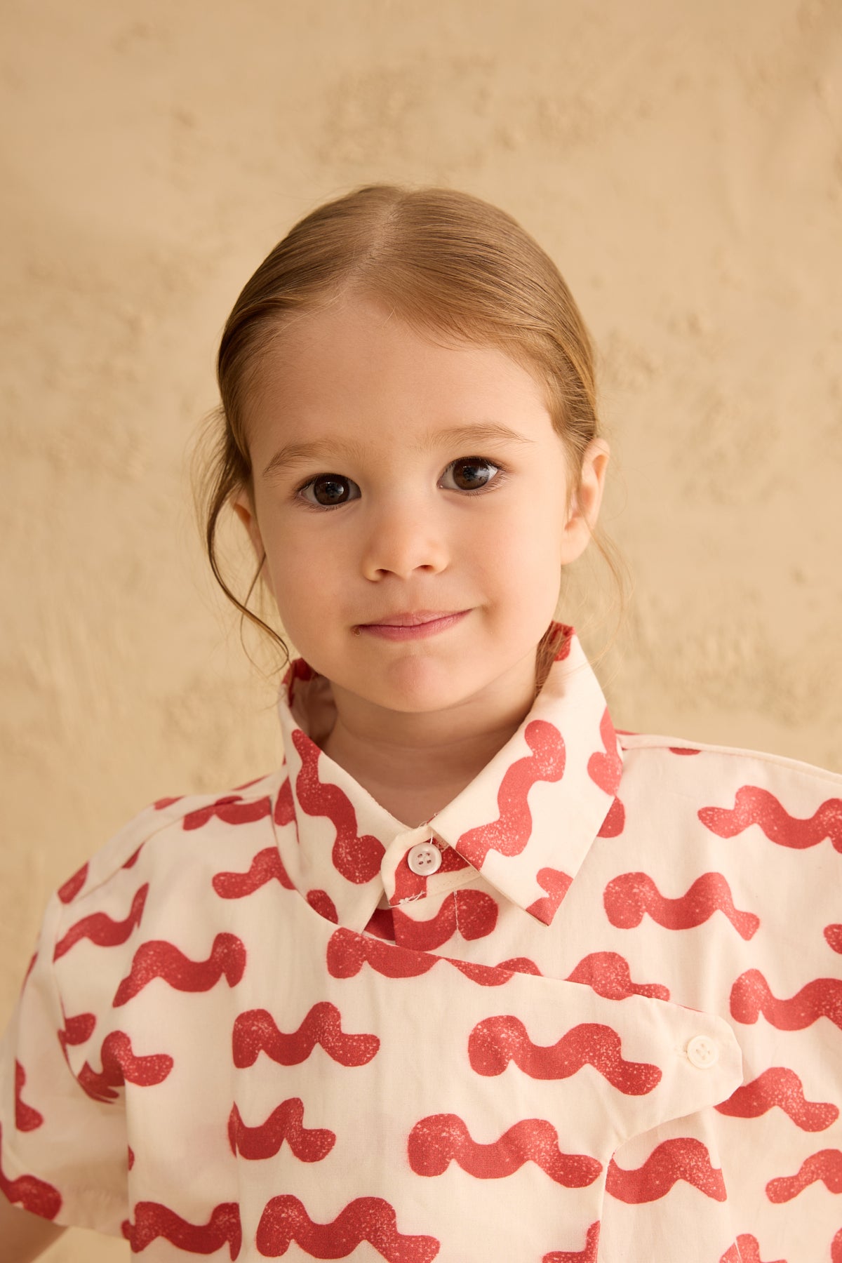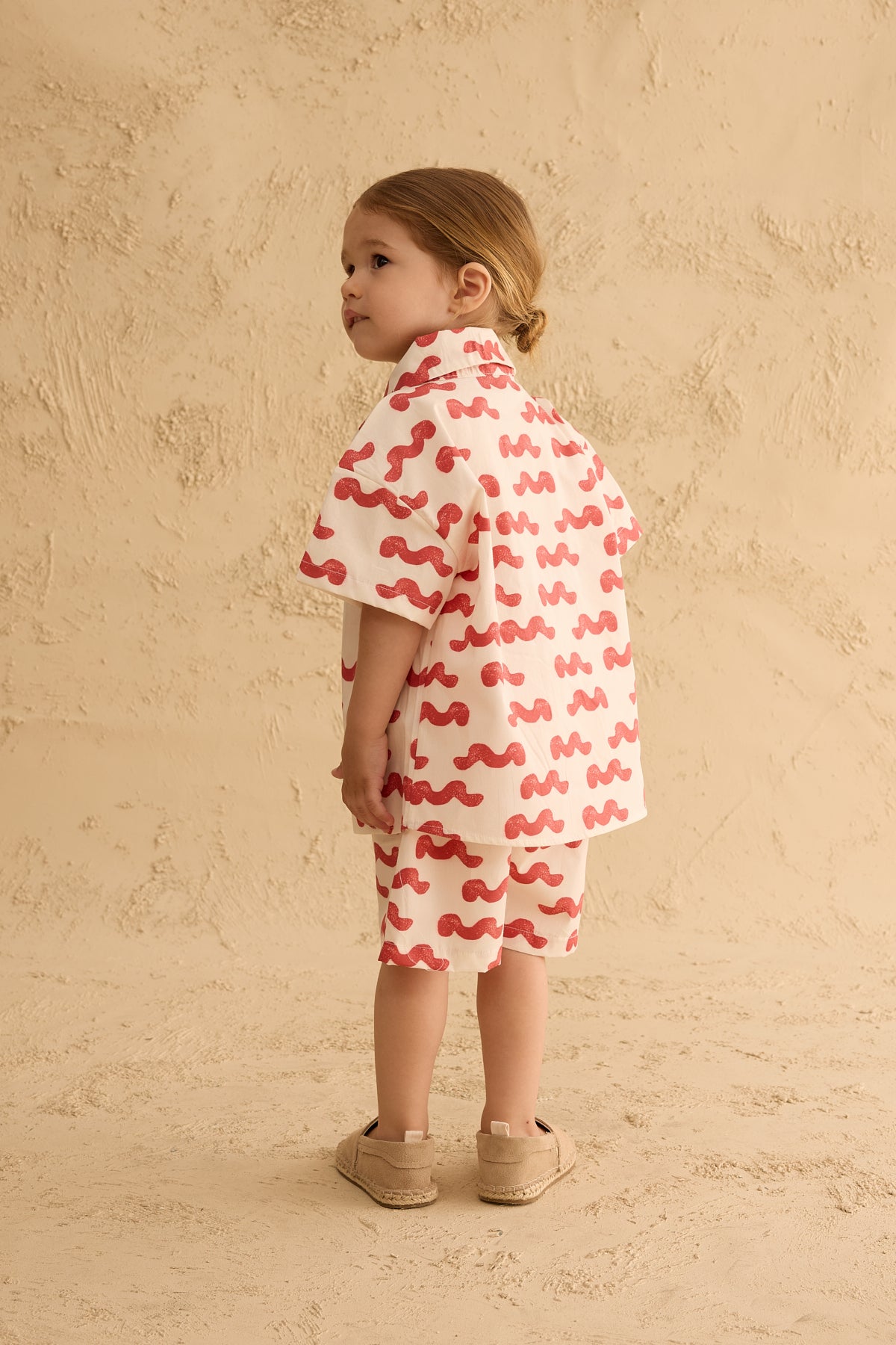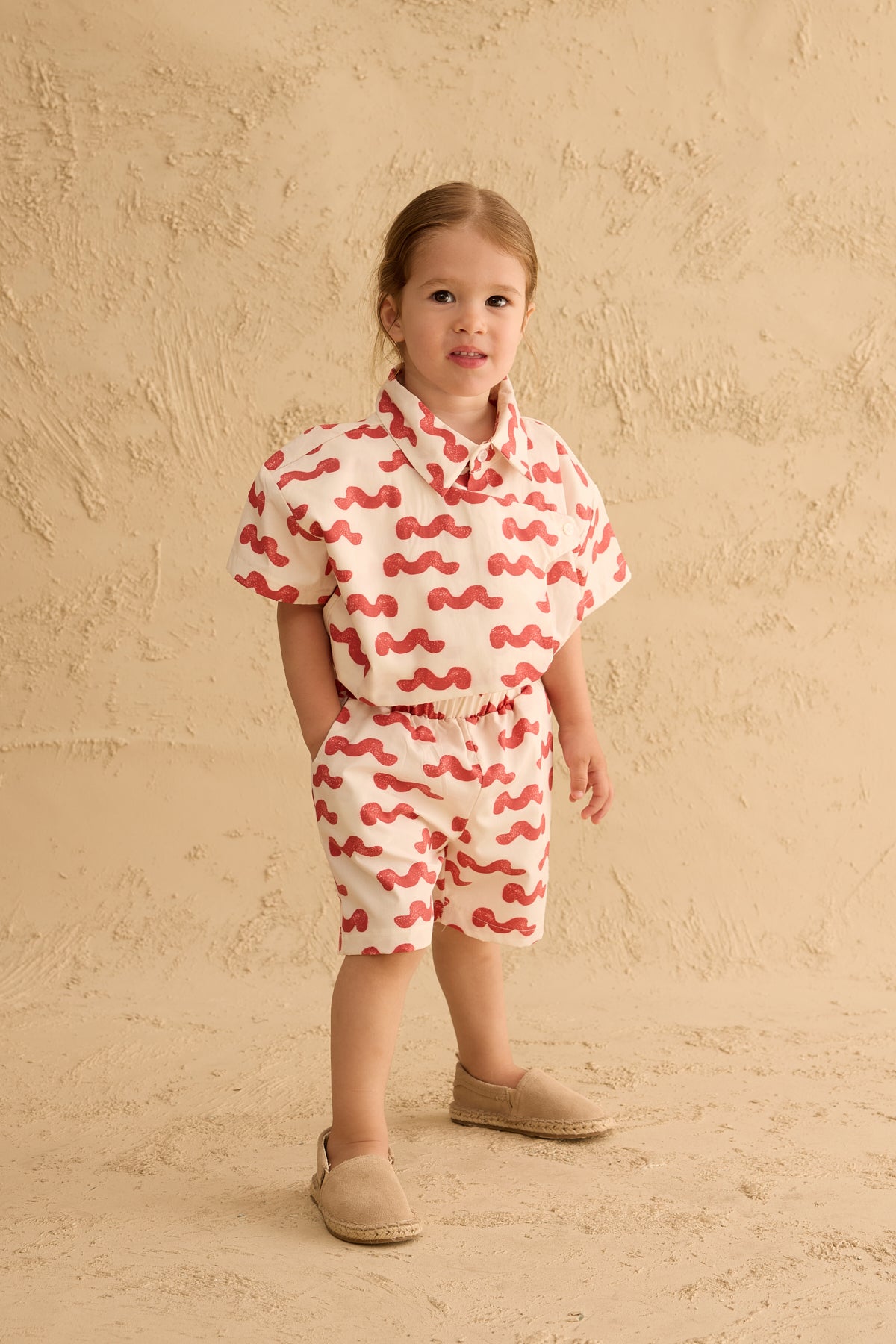 طقم صيفي أنيق للأطفال بلون أحمر مميز، مصنوع من قطن عضوي بنقشة فنية وتصميم عملي ومريح.