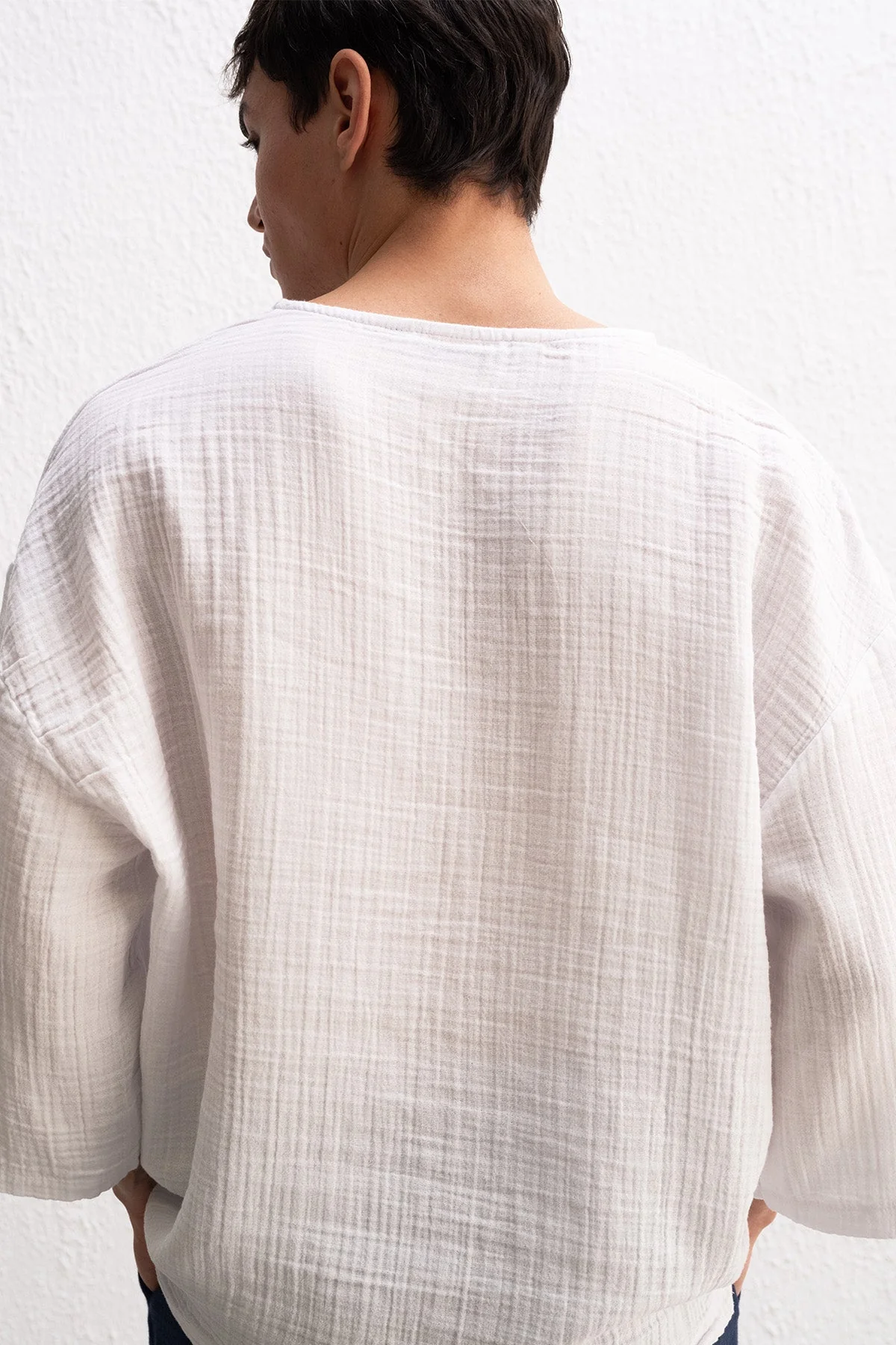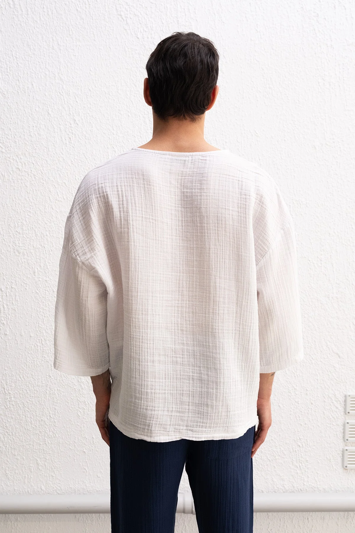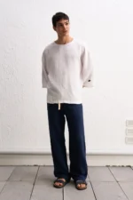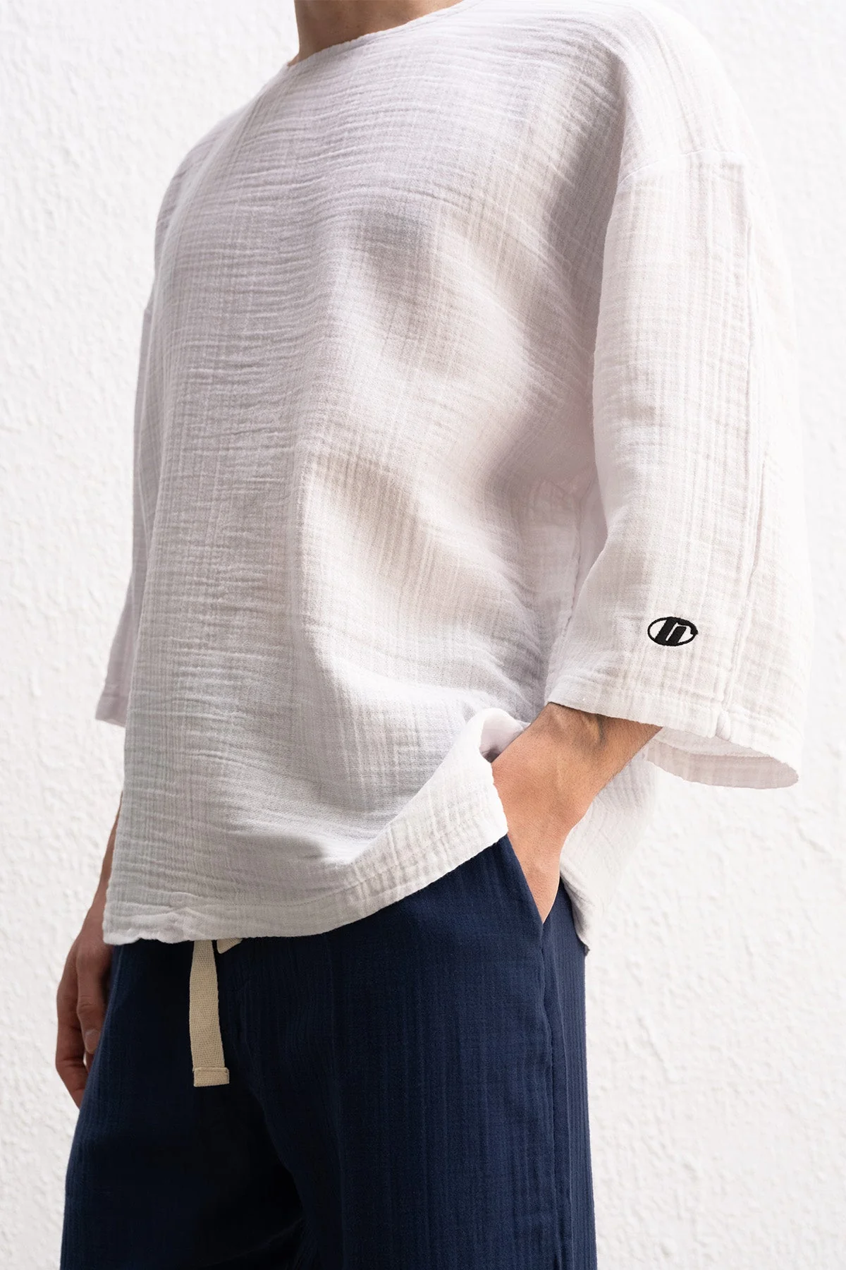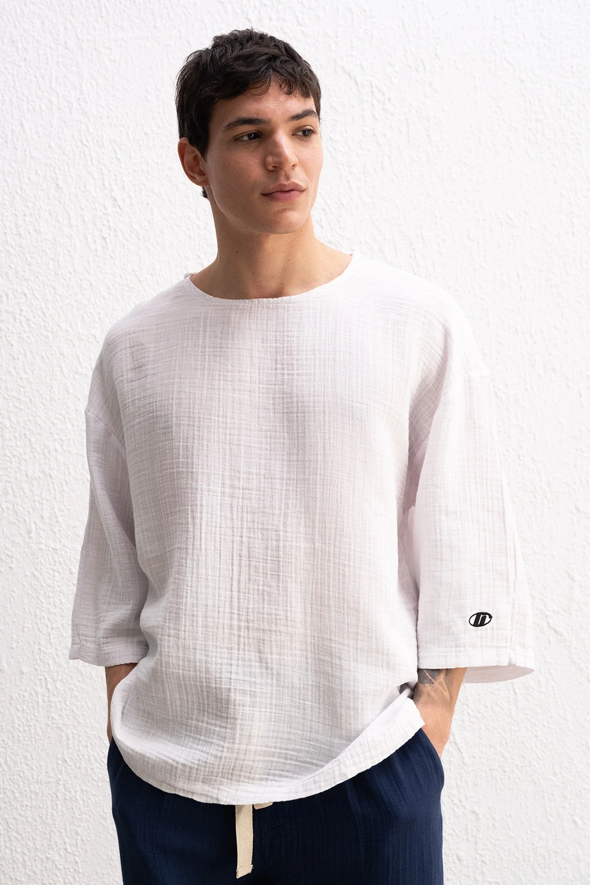 تيشيرت أبيض بقصة مريحة وتصميم نص كم