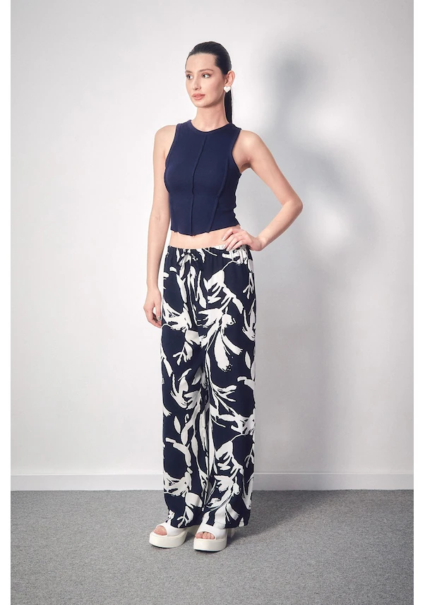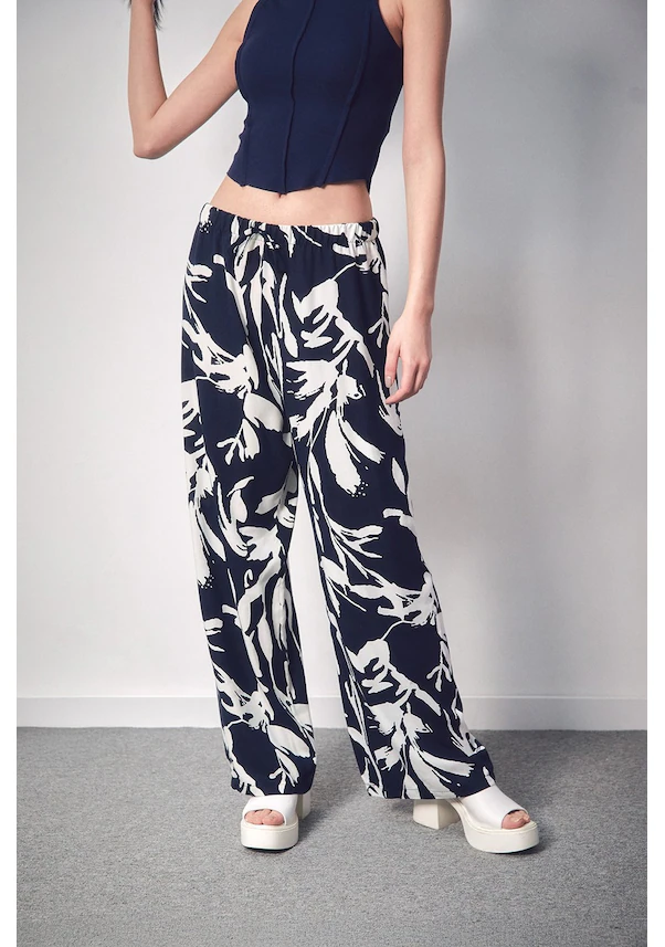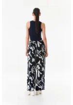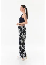 ستمتعي بإطلالة مريحة وأنيقة مع هذا البنطال الواسع المصمم بقصة بالازو بنقشة أوراق ملفتة. مصنوع من خامة فيسكون طبيعية وخفيفة، مع خصر مطاطي يمنحك حرية الحركة والراحة طوال اليوم. طوله يقارب 110 سم، ويُعد خيارًا مثاليًا للإطلالات اليومية الصيفية أو التنسيقات الكاجوال.