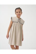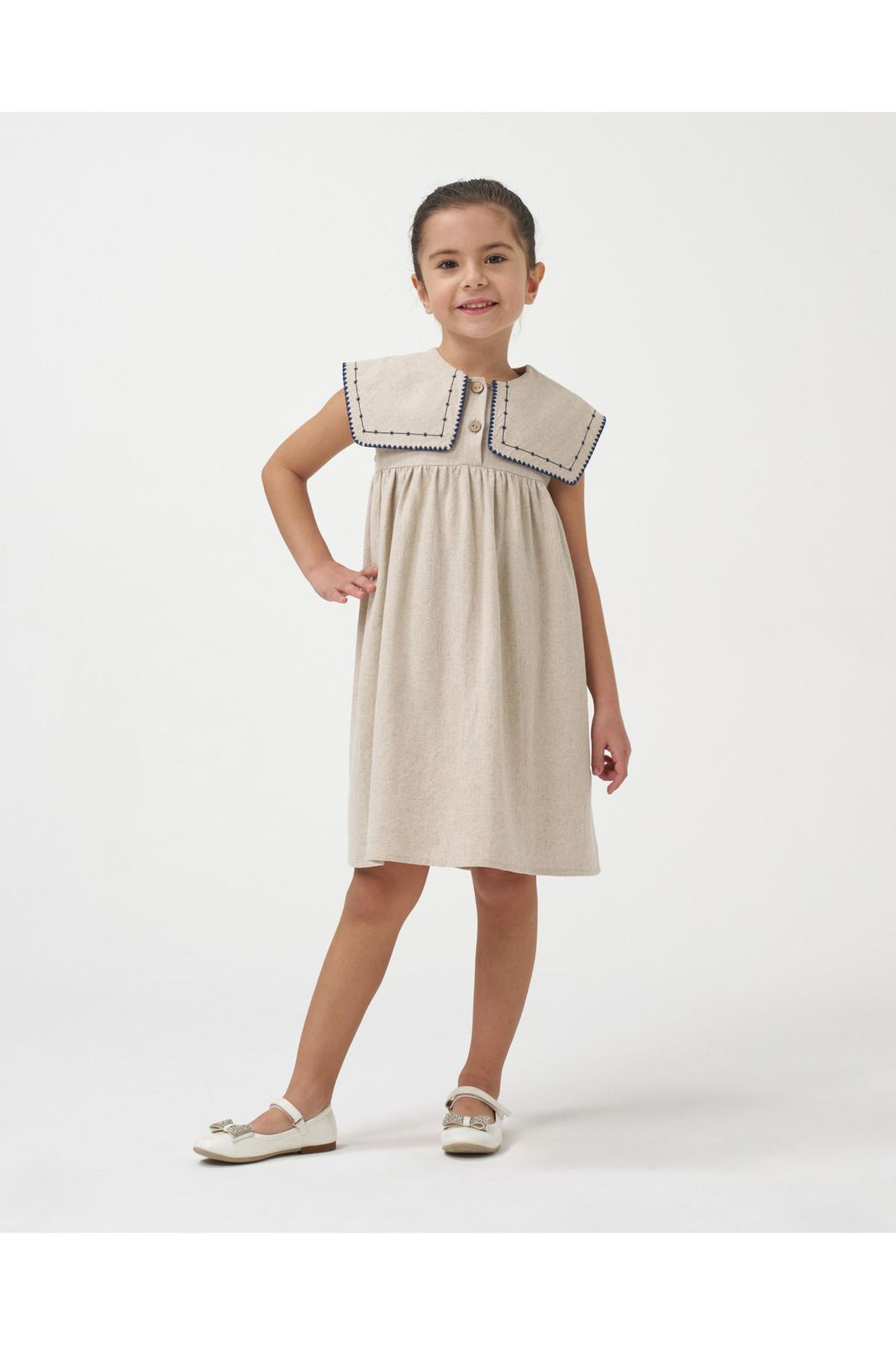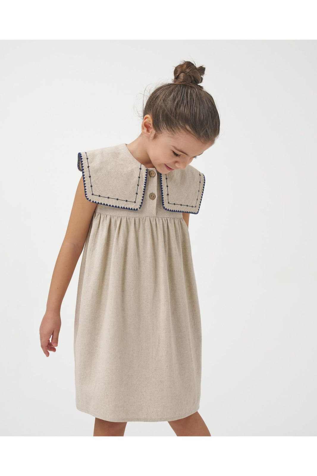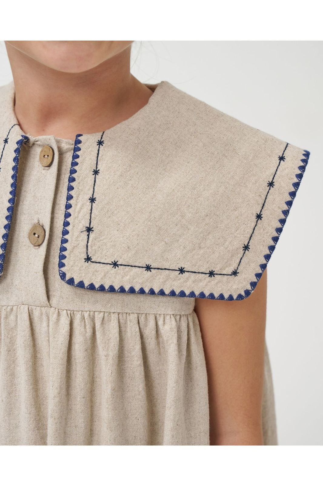 قصة نظامية (Regular Fit) مع ياقة بأزرار للإغلاق، بدون أكمام، بدون بطانة، وخالية من الجيوب. تتميز بتفاصيل تطريز بسيطة تضيف لمسة أنثوية ناعمة.