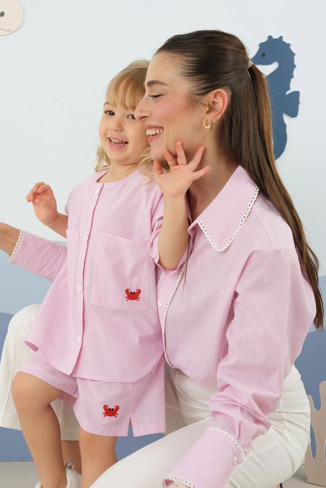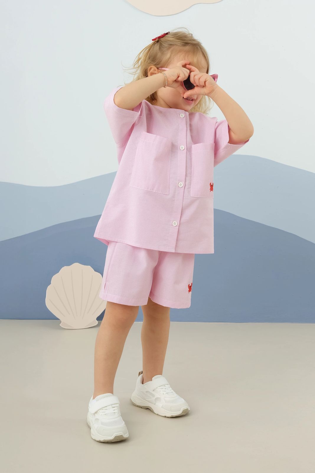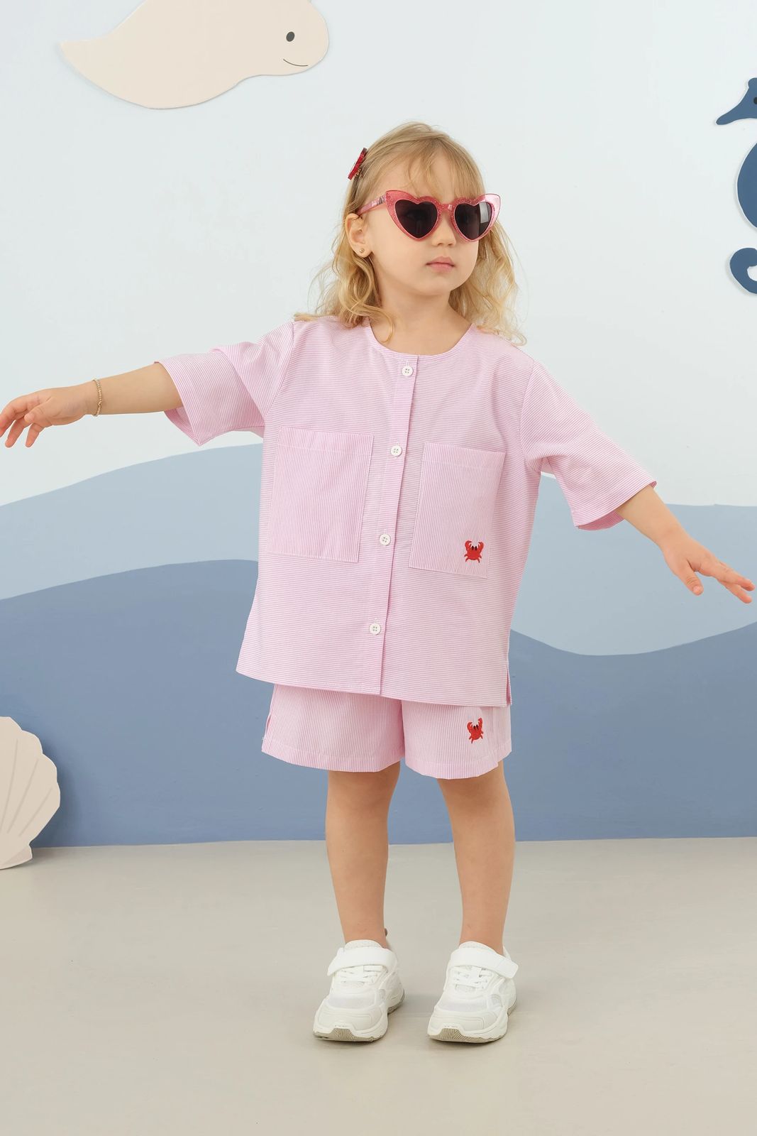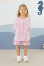 طقم أطفال صيفي من Mioma Kids باللون الوردي المخطط مع تفاصيل تطريز أنيقة تضيف لمسة جمالية مميزة لإطلالة طفلتك.