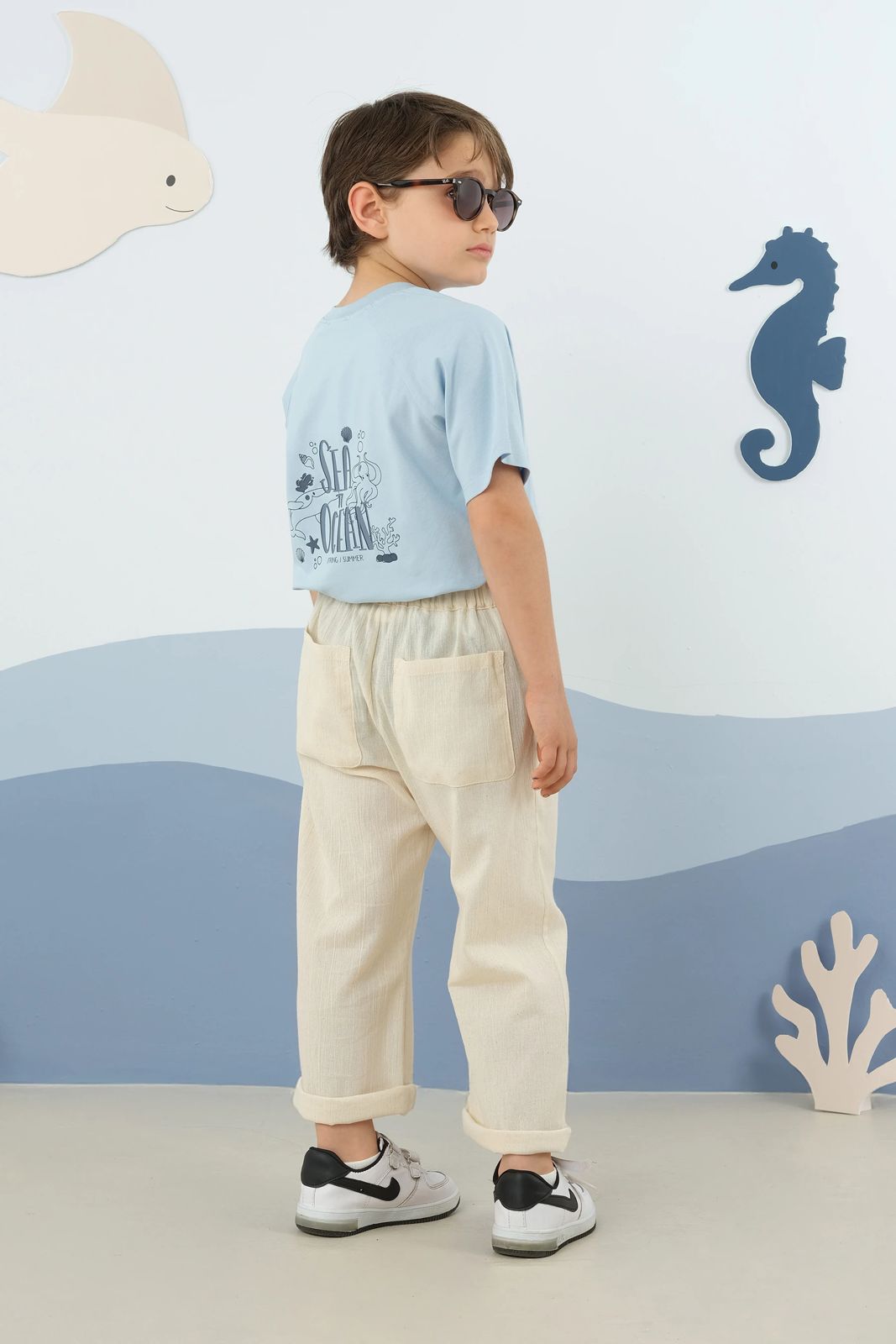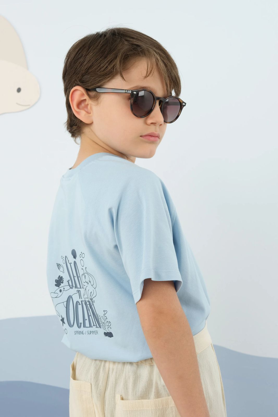 تيشيرت أطفال أنيق مصنوع من قماش ناعم يحتوي على 95% قطن، يتميز بأكمام راجلان القصيرة وتصميم خلفي مطبوع يضفي لمسة عصرية على إطلالة الطفل. يأتي بقَصّة مناسبة تمامًا لعمر الطفل ليمنح راحة وأناقة في نفس الوقت.