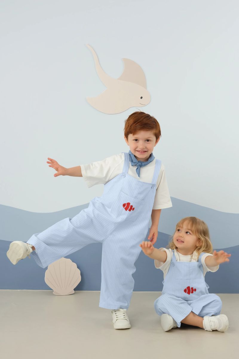 يتميز بتطريز أنيق وجيوب عملية في الأمام والخلف، كما يمكن تعديل طول الحمالات بفضل أماكن الأزرار المختلفة ليناسب طول الطفل بشكل مثالي.