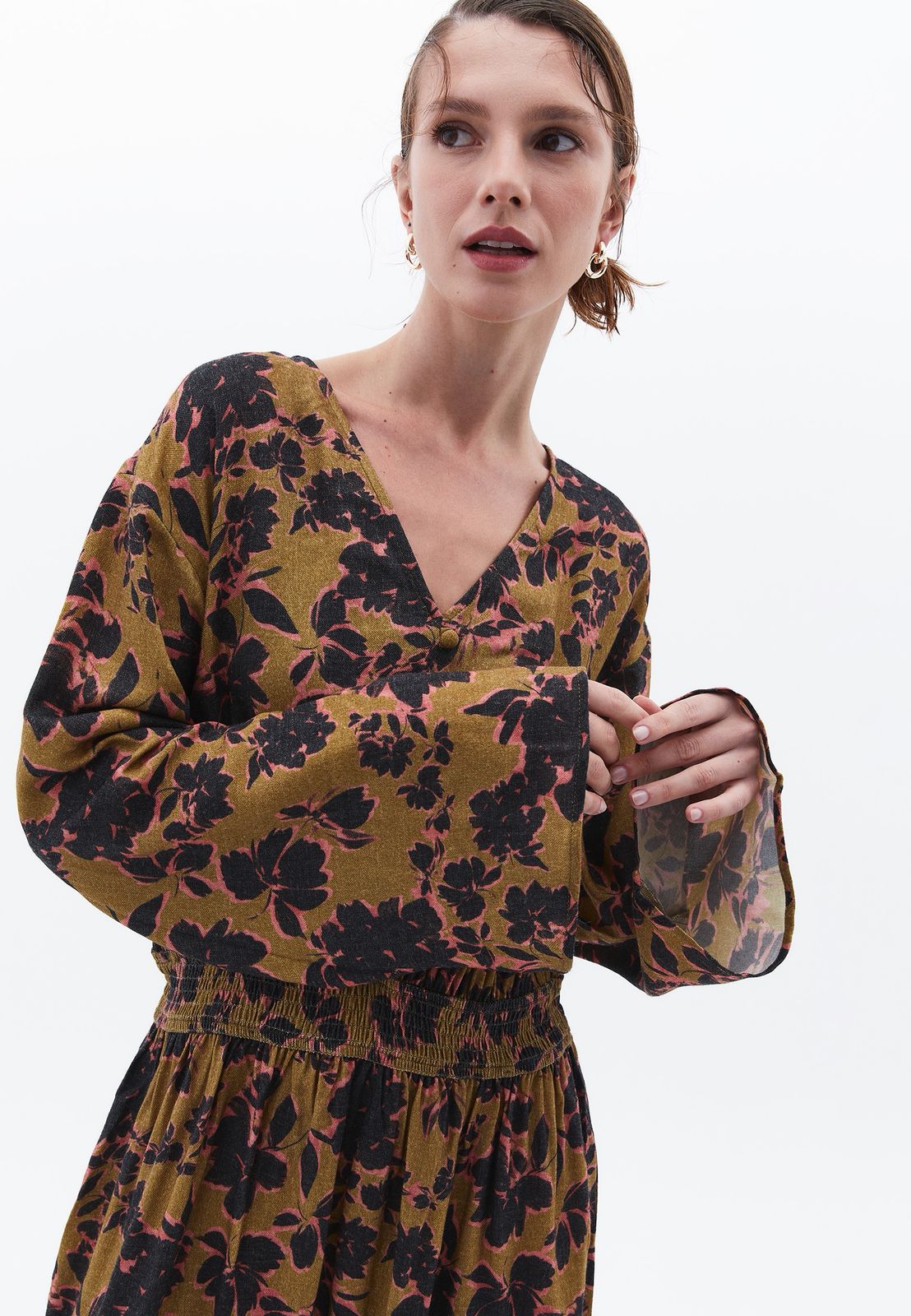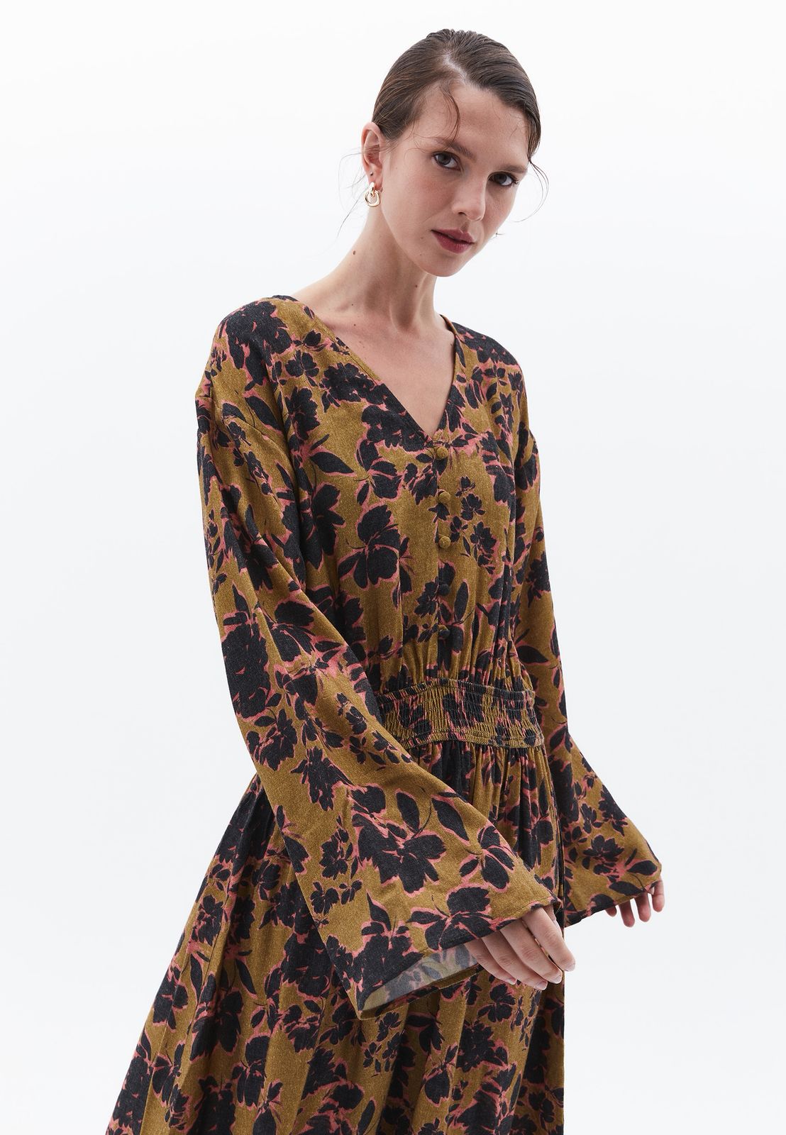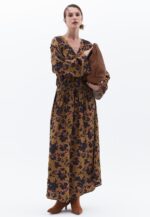 فستان طويل بتفاصيل مطاطية مريحة، يجمع بين الأناقة والعملية لإطلالة صيفية مثالية.
